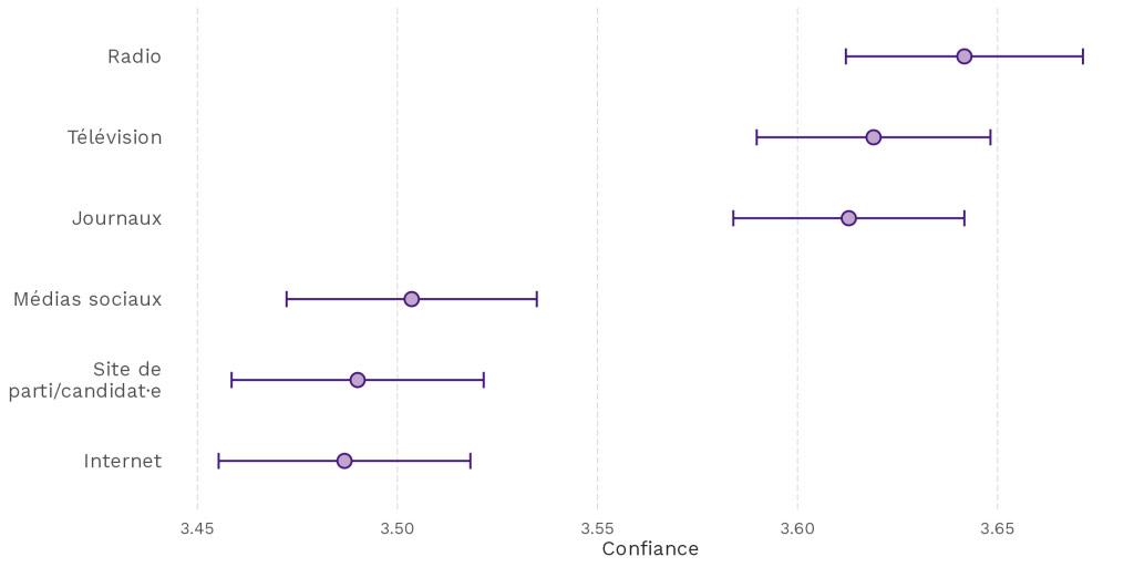 Cette consommation d’information est aussi liée à la confiance des individus dans les institutions politique. La Figure 2 présente la moyenne de la confiance dans les institution selon le type de source.